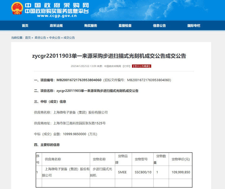 据中国政府采购网公示,上海微电子装备(集团)股份有限公司(以下简称“上海微电子”)中标zycgr22011903采购步进扫描式光刻机项目,设备数量为一台,成交金额10999.985万元。