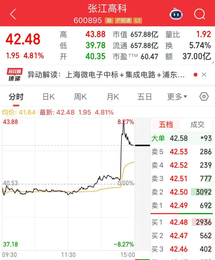 市场方面,张江高科今日(25日)午后盘中直线拉升,一度涨超8%,截至收盘,涨幅为4.81%。